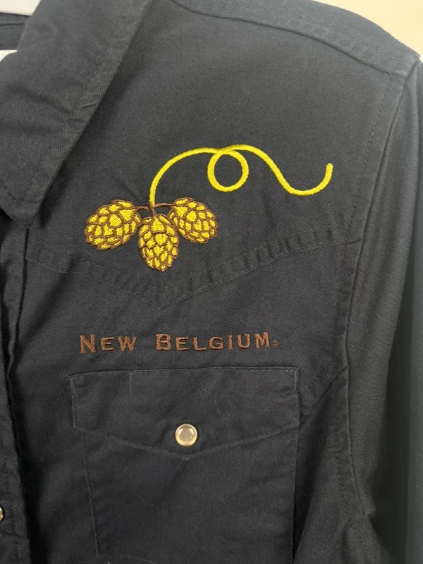 Distinctive Embroidery: Features intricate yellow embroidery of hop cones on the shoulders, along with "New Belgium" branding, appealing to brewery collectors and enthusiasts.