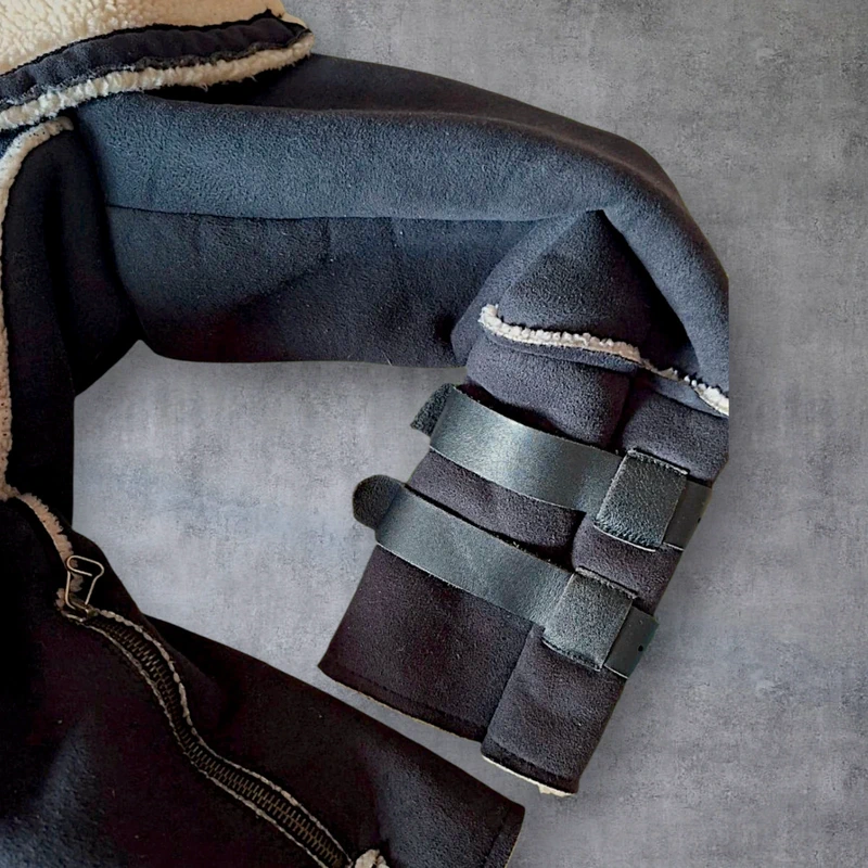 Edgy Design: Features an asymmetrical zip closure, bold leather-look strap and buckle details on the cuffs and hem, giving it a distinct biker or aviator aesthetic.